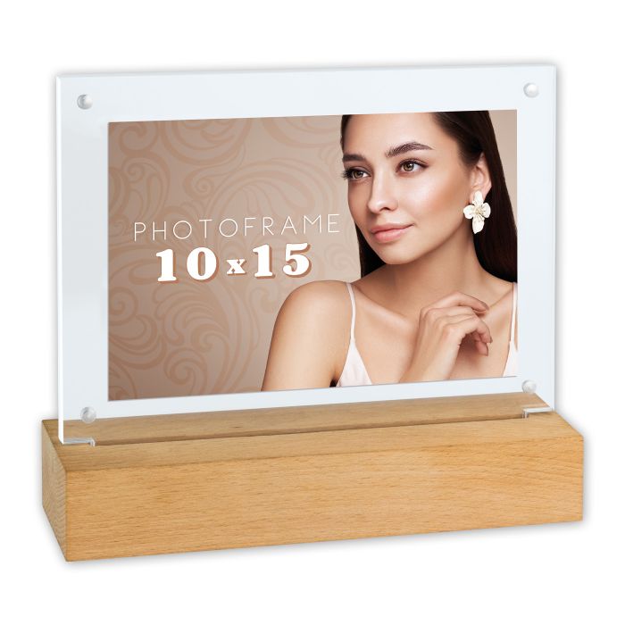 Moderner Acryl-Fotorahmen mit Holzsockel und dezenter LED-Beleuchtung. Das doppelseitige Design zeigt zwei Fotos im Format 10x15 cm. Perfekt für den Tisch zu Hause oder im Büro. Stilvoll, warm und einfach zu wechseln.