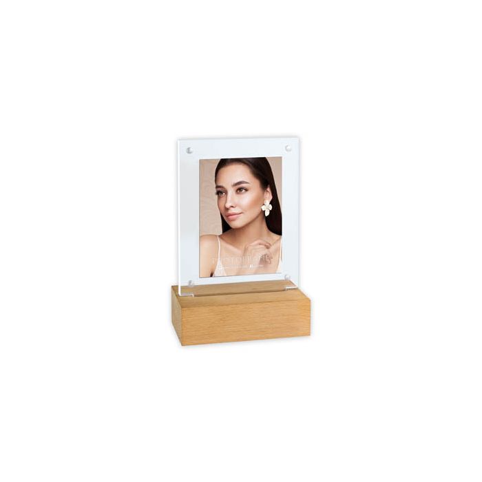 Der New York N Vertikal Acrylrahmen 13×18 ist ein moderner Rahmen mit Acrylplatten, Holzfuß und LED-Licht. Zeigt zwei Fotos gleichzeitig und lässt sich per Magnet schnell wechseln – perfekt für Tisch oder Regal.