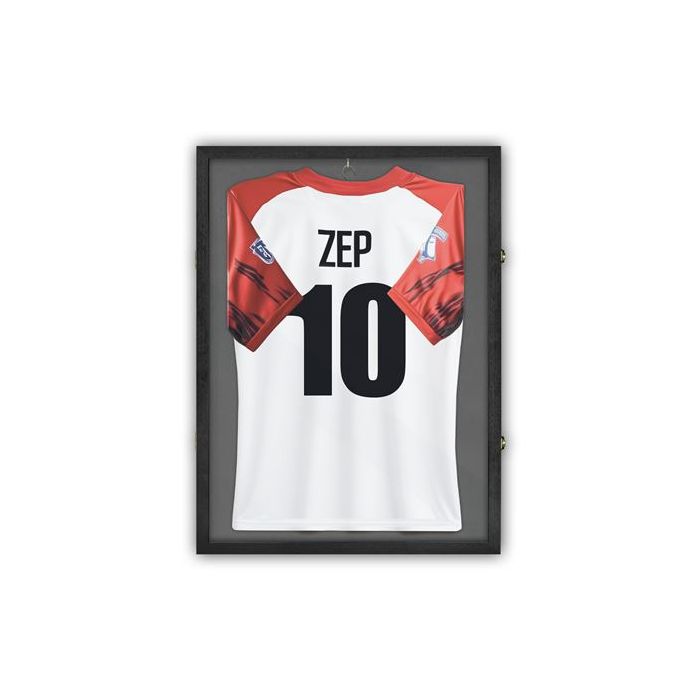 Het Zep Italia Jersey Pakket combineert een zwarte en een natuurlijke houten shirtlijst voor een luxe, professionele presentatie van sportshirts in elk interieur.