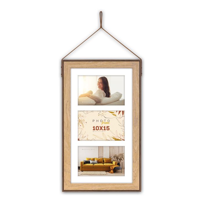 Holz-Collage-Fotorahmen für 3 Fotos im Format 10x15 cm mit Naturholz, braunen Details und dekorativem Lederband. Perfekt für die Wand zu Hause oder im Büro. Warmes Design und auch eine tolle Geschenkidee.