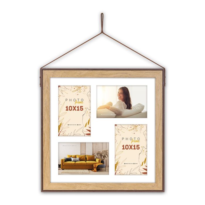Holz-Collage-Fotorahmen für 4 Fotos im Format 10x15 cm mit Naturholz, braunen Details und dekorativem Lederband. Ideal für die Wand zu Hause oder im Büro. Zeitloses Design und eine schöne Geschenkidee.